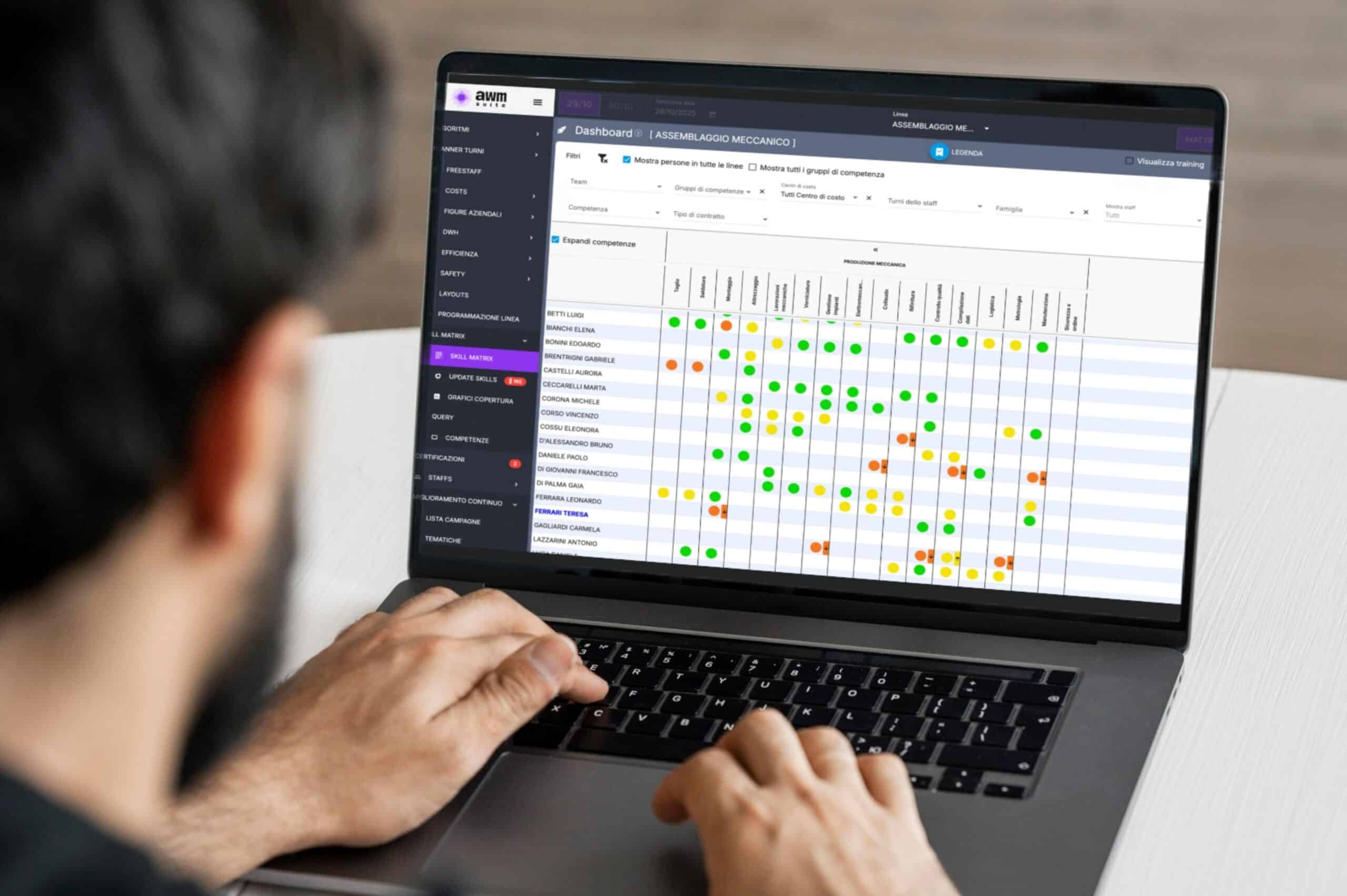 AWMS is the digital solution that allows you to plan your workforce, both in production and in the warehouse, in a simple and effective way. Thanks to AWMS, you can organize the work of operators taking into account skills, physical limitations and professional development, and always ensuring compliance with company compliance and labor law regulations (rotations, contractual limitations, mandatory rest, etc.).