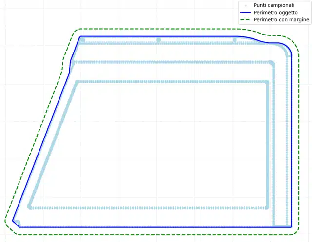 - Proiezione e Alpha Shape: L’algoritmo campiona punti lungo i bordi delle facce del modello 3D e li proietta sul piano base. Su questi punti viene calcolato il perimetro della figura.