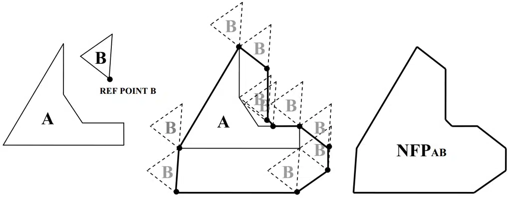 - No-fit polygon (NFP): È l’area proibita che si forma attorno a un pezzo già piazzato (A), all’interno della quale il punto di riferimento di un nuovo pezzo (B) non può entrare. Posizionando il punto di riferimento di B: